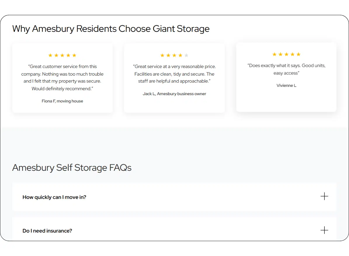 “Self storage Salisbury” is a very different search from “business storage Yeovil.” We treated each one as its own landing page, with locally relevant content, customer reviews from that specific site, and schema markup that tells Google exactly what’s on offer.